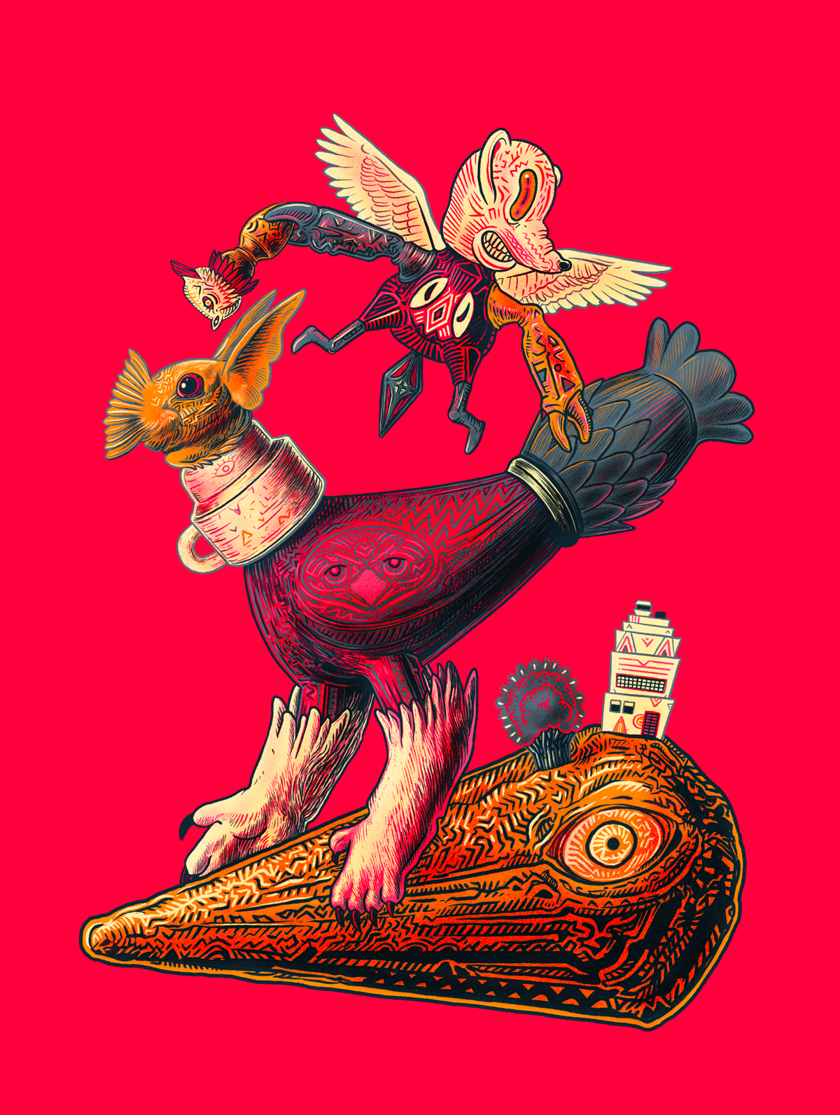 Il suo universo creativo è una fusione esplosiva di tecniche analogiche e digitali, popolato da personaggi e creature fuori dall’ordinario.